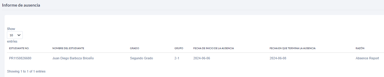 - En la página inicial, se muestra un listado de todos los reportes de ausencia realizados durante el periodo lectivo.