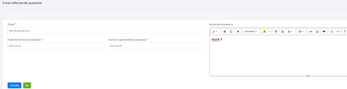 - Haga clic en Nuevo para crear un nuevo reporte de ausencia.