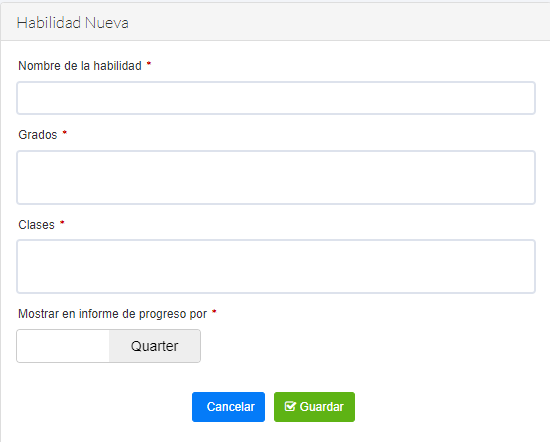 - Aquí podrá crear y administrar las habilidades que los maestros evaluarán a lo largo del curso.