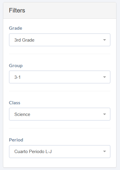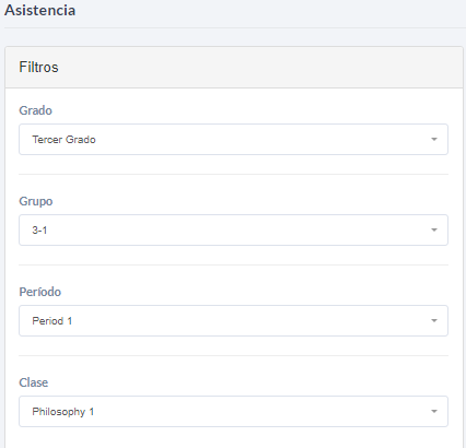 - Seleccionar Filtros: En la primera tabla de esta funcionalidad, el docente debe escoger los filtros de Grado, grupo, periodo y clase para tomar la asistencia del grupo de estudiantes que está atendiendo. Estos filtros aseguran que el maestro esté registrando la asistencia en la clase correcta.
