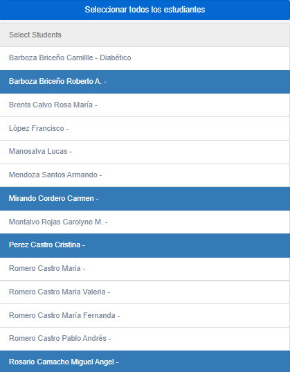 - Desplegar Listado: Una vez seleccionados los filtros, en la segunda tabla se despliega el listado de estudiantes que han sido ligados a la clase seleccionada por el maestro. En el recuadro de Seleccionar todos los estudiantes, se pueden marcar todos los estudiantes de una vez, y si se hace clic sobre alguno de ellos, se puede excluir a ese estudiante de la selección realizada.