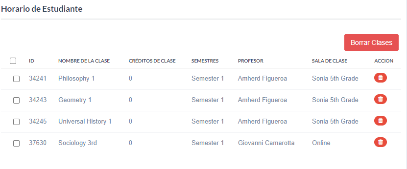- En la casilla Horario del estudiante, revise las clases asignadas para asegurarte de que estén correctamente configuradas.