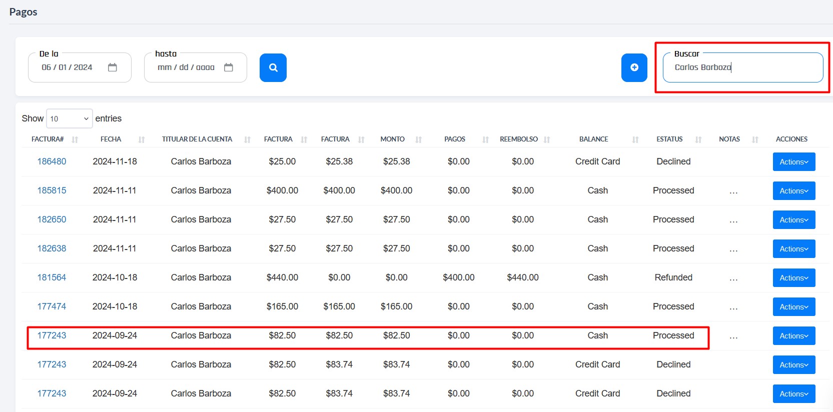 - En la casilla Buscar, coloque el nombre del papá que desea consultar o el número de factura.