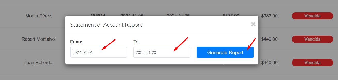En el recuadro que se muestra en la pantalla, se escogen las fechas del Estado de cuenta que se requiere, y se presiona el botón de Generar Reporte.