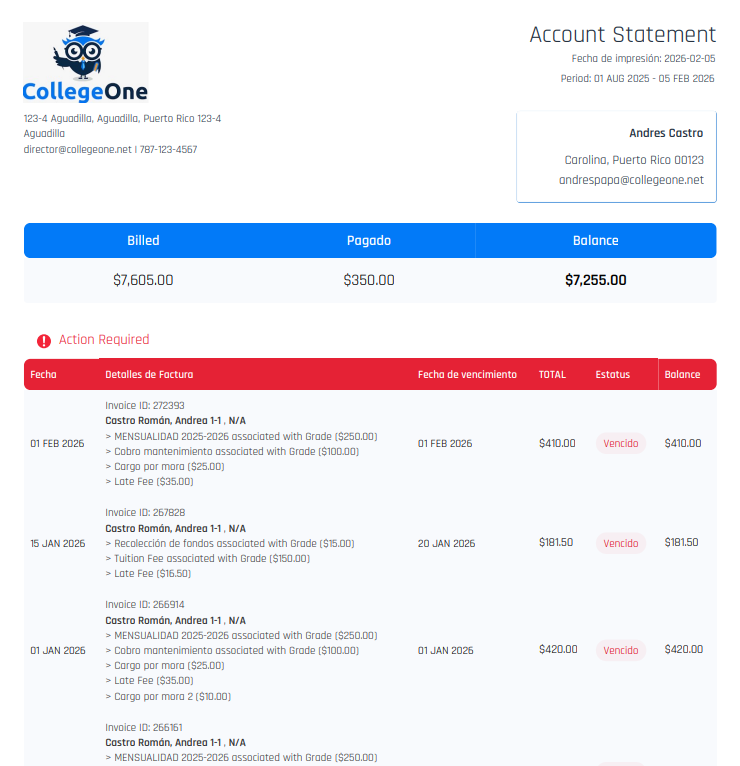 Al escoger las fechas del reporte, se genera un informe detallado de las facturas que se han generado para ese papá en el plazo seleccionado, un balance de crédito y un balance antigüedad de las facturas pendientes de pago