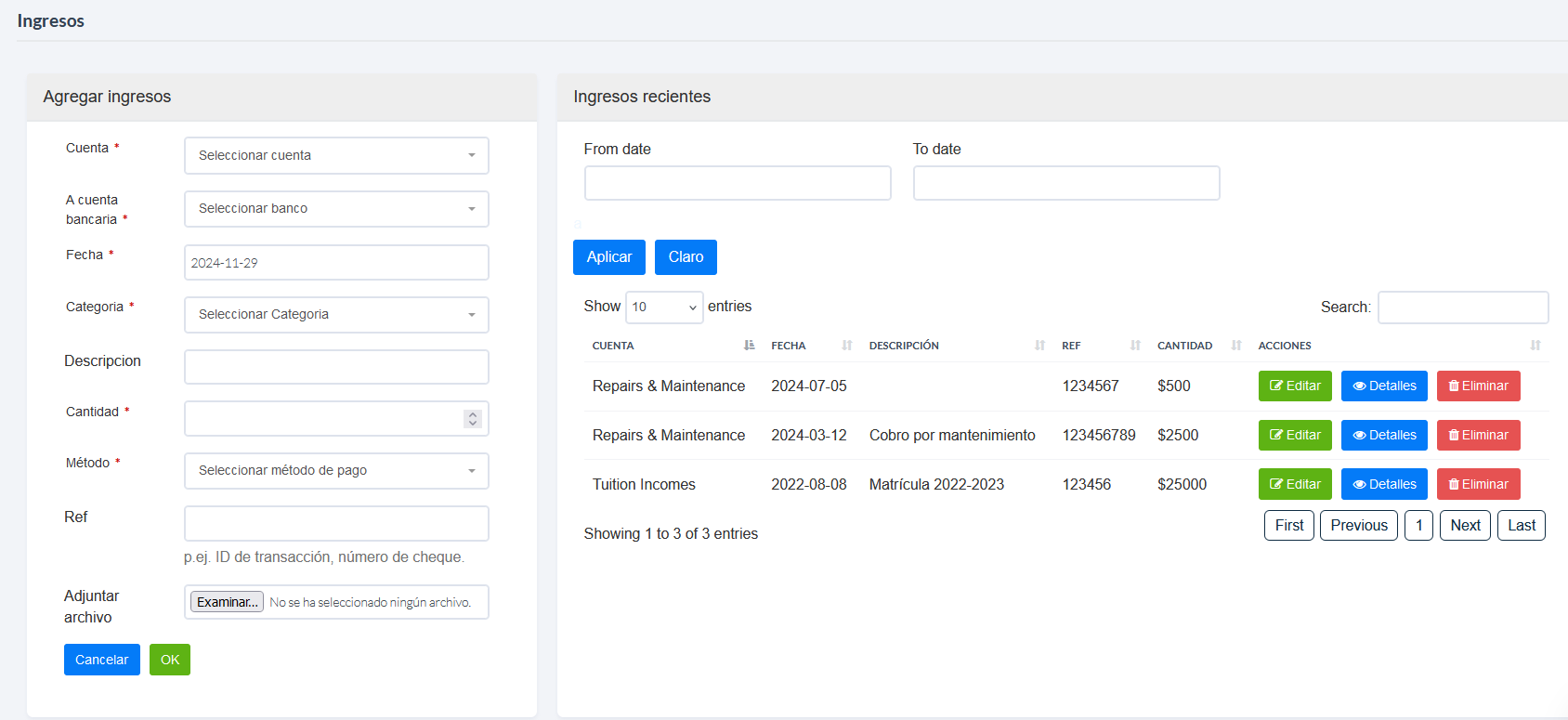 En el recuadro izquierdo de la pantalla, se deben completar todos los datos requeridos para registrar un ingreso. Esto incluye la información específica de la transacción, como la fuente del ingreso y la cantidad recibida. Además, existe la opción de adjuntar un comprobante digital de la transacción. Una vez que se haya ingresado toda la información necesaria, haga clic en OK para guardar el registro.