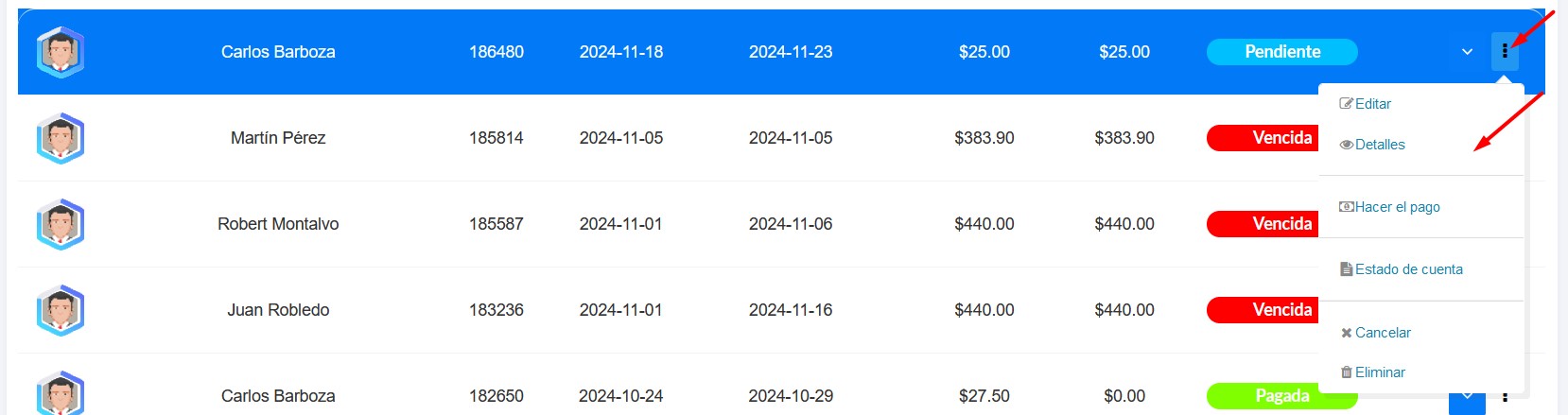 Facilita la administración de pagos, permitiendo seleccionar la factura