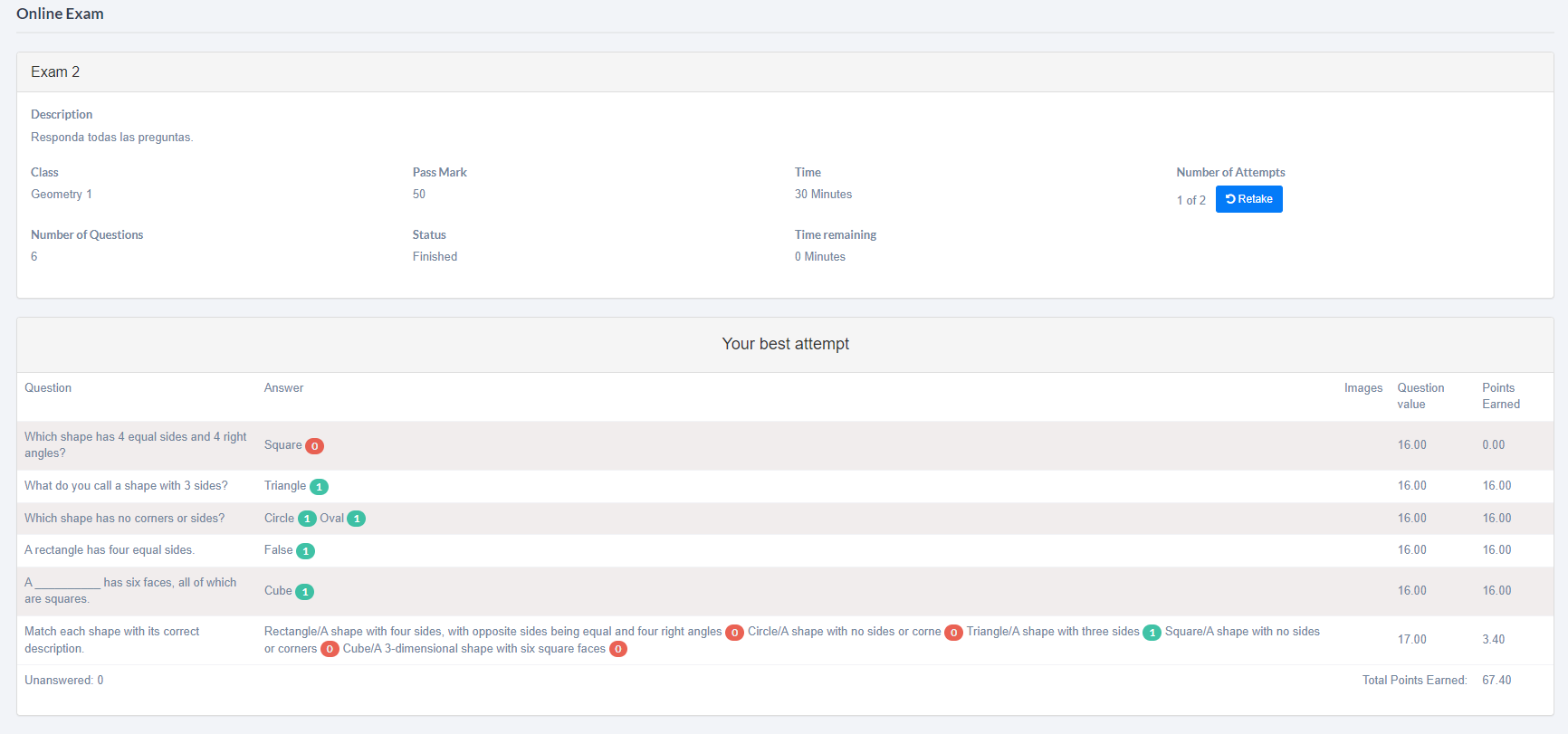 - Answer Questions: The questions will be displayed one by one. They may be in text-writing, single-selection, multiple choice, match, true or false, fill the blank answer format.