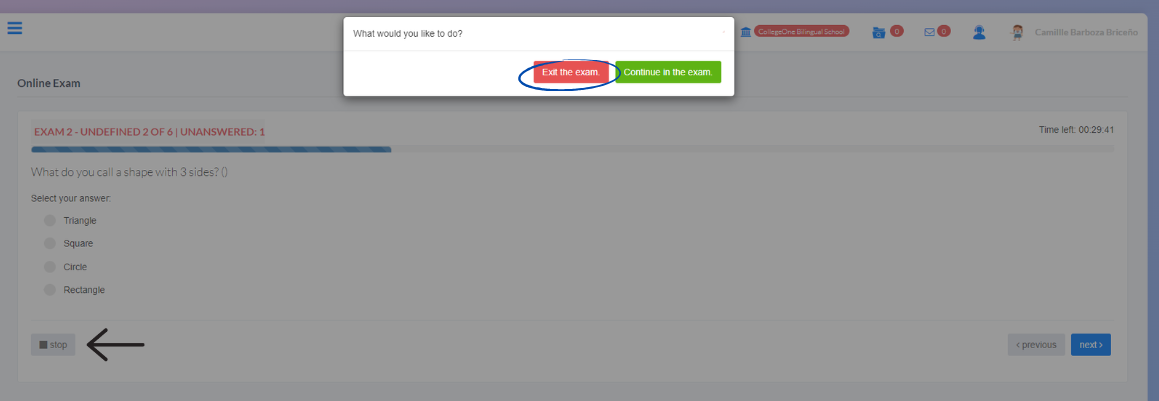 - Click "Stop": If you need to pause the exam, click the "Stop" button.