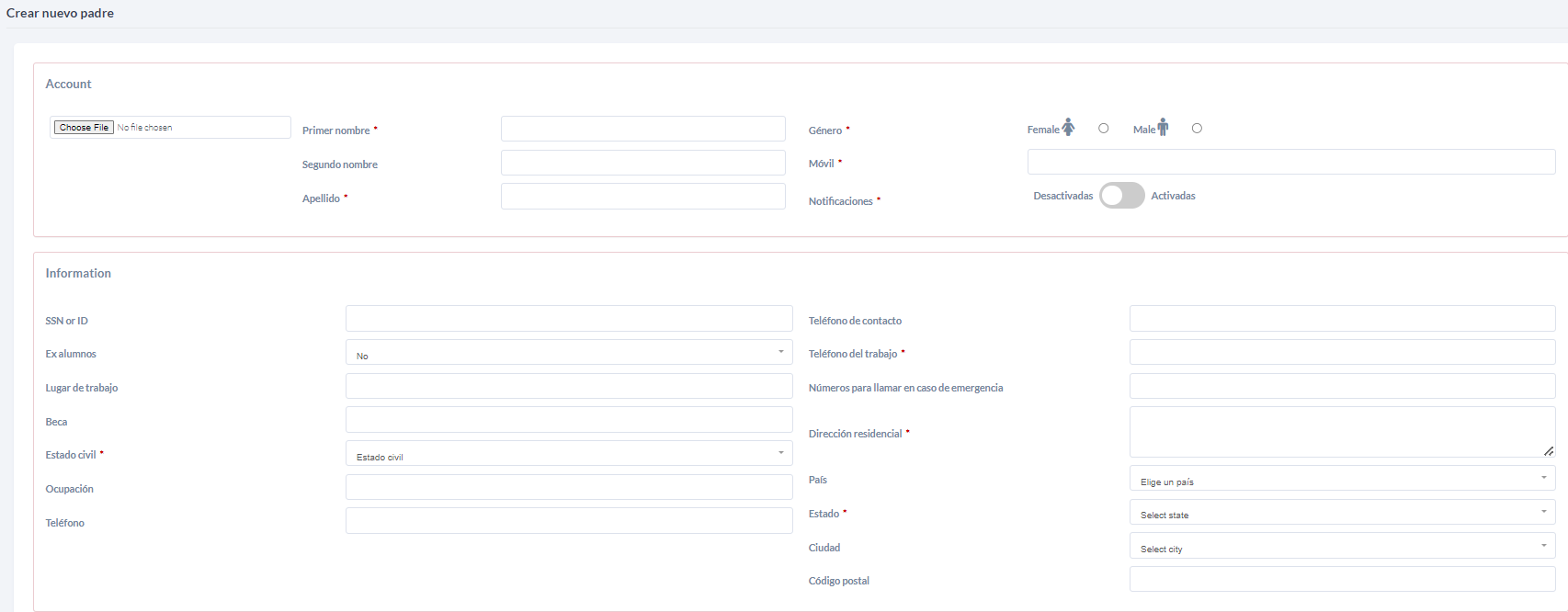 - Haga clic en Nuevo para desplegar un formulario donde deberás ingresar toda la información personal del padre de familia, como nombre completo, números de teléfono, dirección, entre otros.