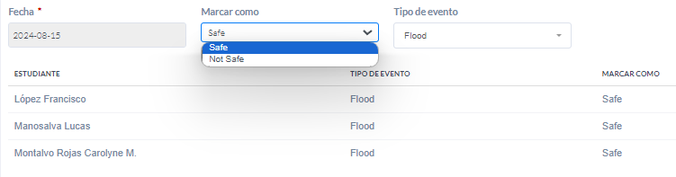 - Establecer Estado: En este paso, el maestro debe establecer el día del evento y en la sección Marcar Como, indicar si el estudiante se encuentra en estado Safe o Not Safe. Esta información es clave para que los padres reciban una notificación clara sobre el estado de sus hijos.