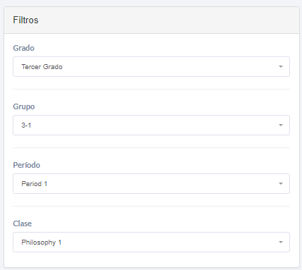 - Elegir Grupo: En la primera tabla, el maestro debe seleccionar el grupo con el que está trabajando en ese momento. Para ello, puede utilizar los filtros conocidos dentro de la plataforma, facilitando la ubicación rápida del grupo correspondiente.