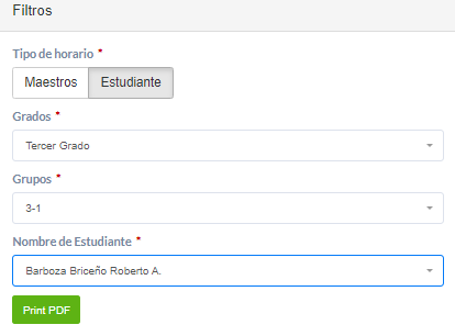 Esta funcionalidad permite al personal de la institución consultar y visualizar el horario de un maestro o de un estudiante, con opciones para imprimir la información en formato PDF.