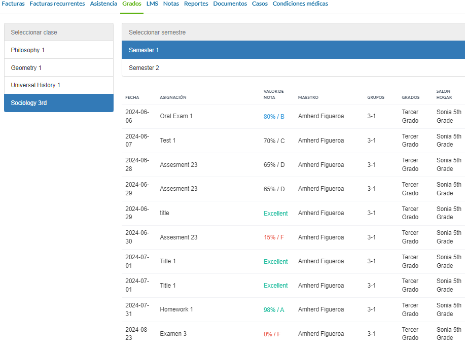 - Aparecerán las calificaciones otorgadas para esa clase.