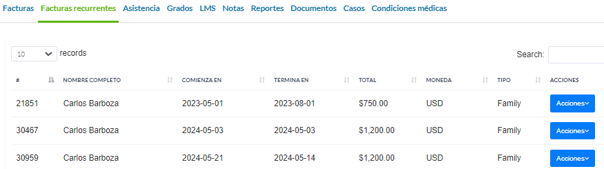 - En la pestaña Facturas Recurrentes, se pueden revisar las facturas recurrentes de la familia.