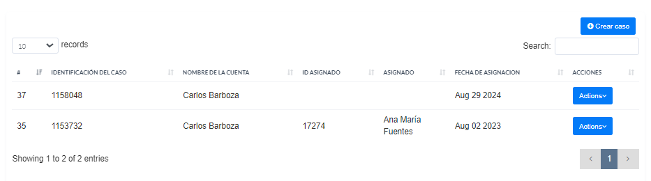 - El botón Acciones ofrece pasos adicionales para gestionar los casos, como asignarlos a personal específico.