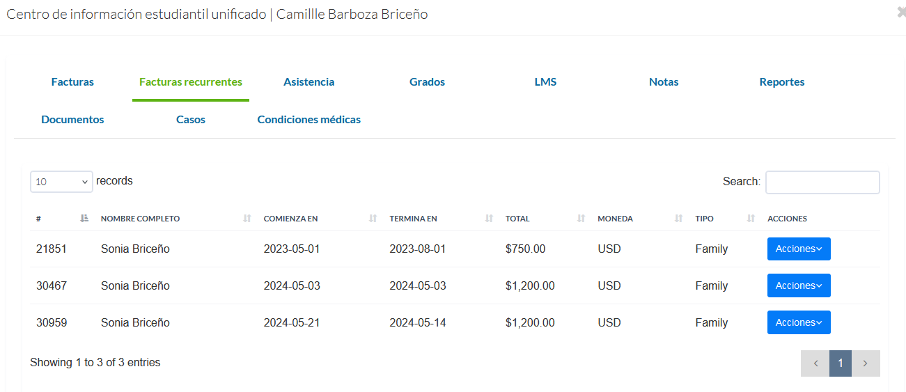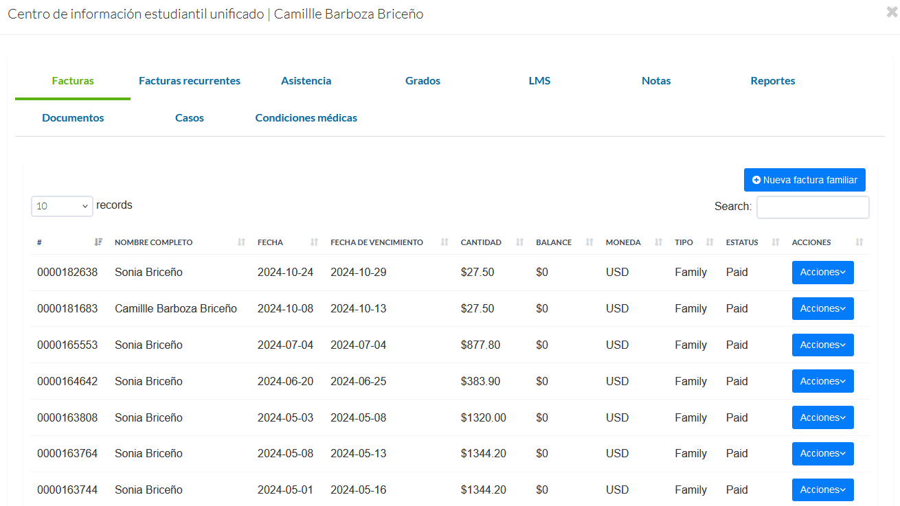 Facturas: En esta pestaña, puede ver un registro completo de todas las facturas generadas a nombre del padre del estudiante. Permite crear nuevas facturas mediante Nueva Factura Familiar. Además, el botón Acciones ofrece opciones adicionales para gestionar cada factura.