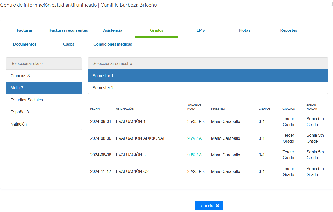 - Grados: Acceda a las calificaciones asignadas en cada Clase. Seleccione el Semestre y la Clase para ver la calificación correspondiente.