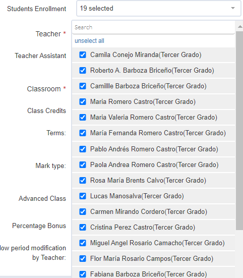 In the 'Student Enrollment' section, ensure that all the students in this list are checked.